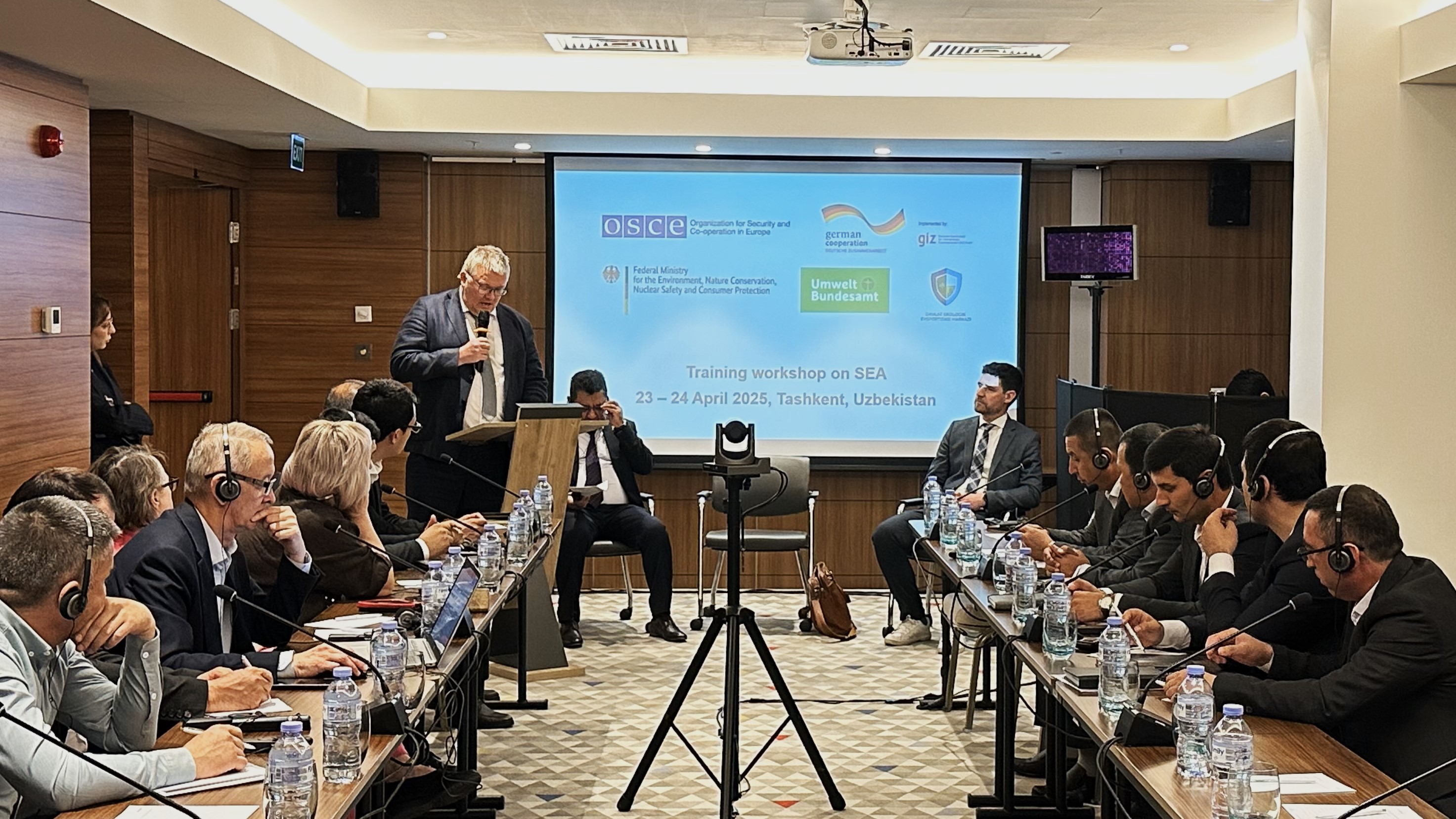 Participants in an OSCE training workshop in Tashkent discussing effective evaluation of potential environmental policies, plans and programmes in Uzbekistan, 23 April 2025.